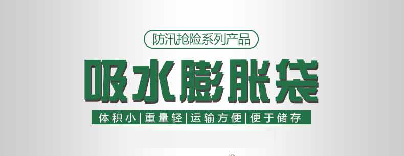 膨脹防洪袋,使用前體積小,重量輕,存放,運輸方便。與傳統的沙袋相比,在搶險防洪時大大減小時間和人力,另防洪搶險更有效率。吸水膨脹袋屬環保產品,無毒,無害,無味,無污染。可自然降解。
