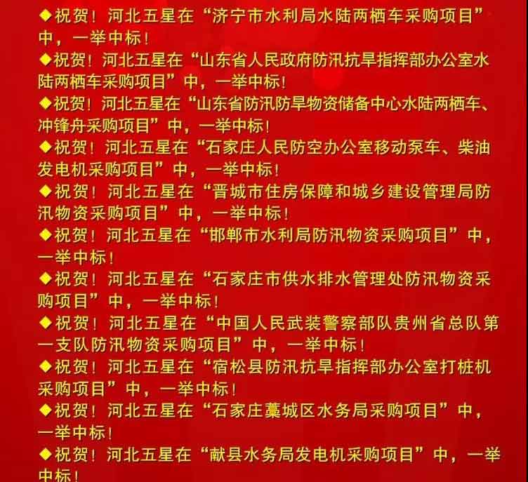 是我國防汛抗旱、搶險救災、應急減災救援和電力設備及安全工器具、市政設施、地下管網行業中,集科研、開發、生產、銷售及服務于一體的現代化技術裝備高新技術企業。我公司多次中標項目,榮譽成就屬于過去,河北五星永駐輝煌。